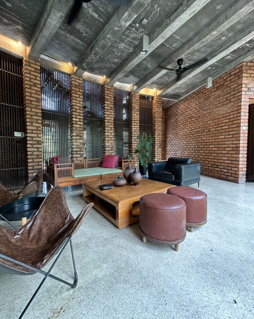 The level above meanwhile houses the bedrooms, family area, and a even a yoga deck. The level below has a separate staircase from the outside to cater as a separate for studio and a discussion area for work. An amazing thing to note is that this area operates entirely without air-conditioning but remains cool throughout the day. This is owing to the natural materiality of the house like bricks and timber backed by unadorned fair- face concrete finishes.