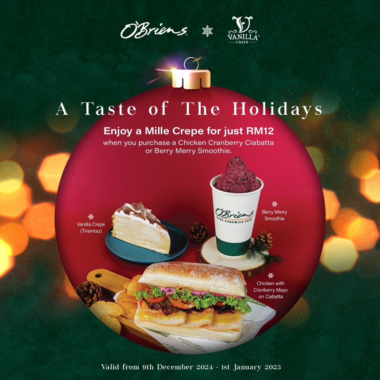 Enjoy a Mille Crepe for just RM12 when you purchase a Chicken Cranberry Ciabatta or Berry Merry Smoothie at O’Briens.