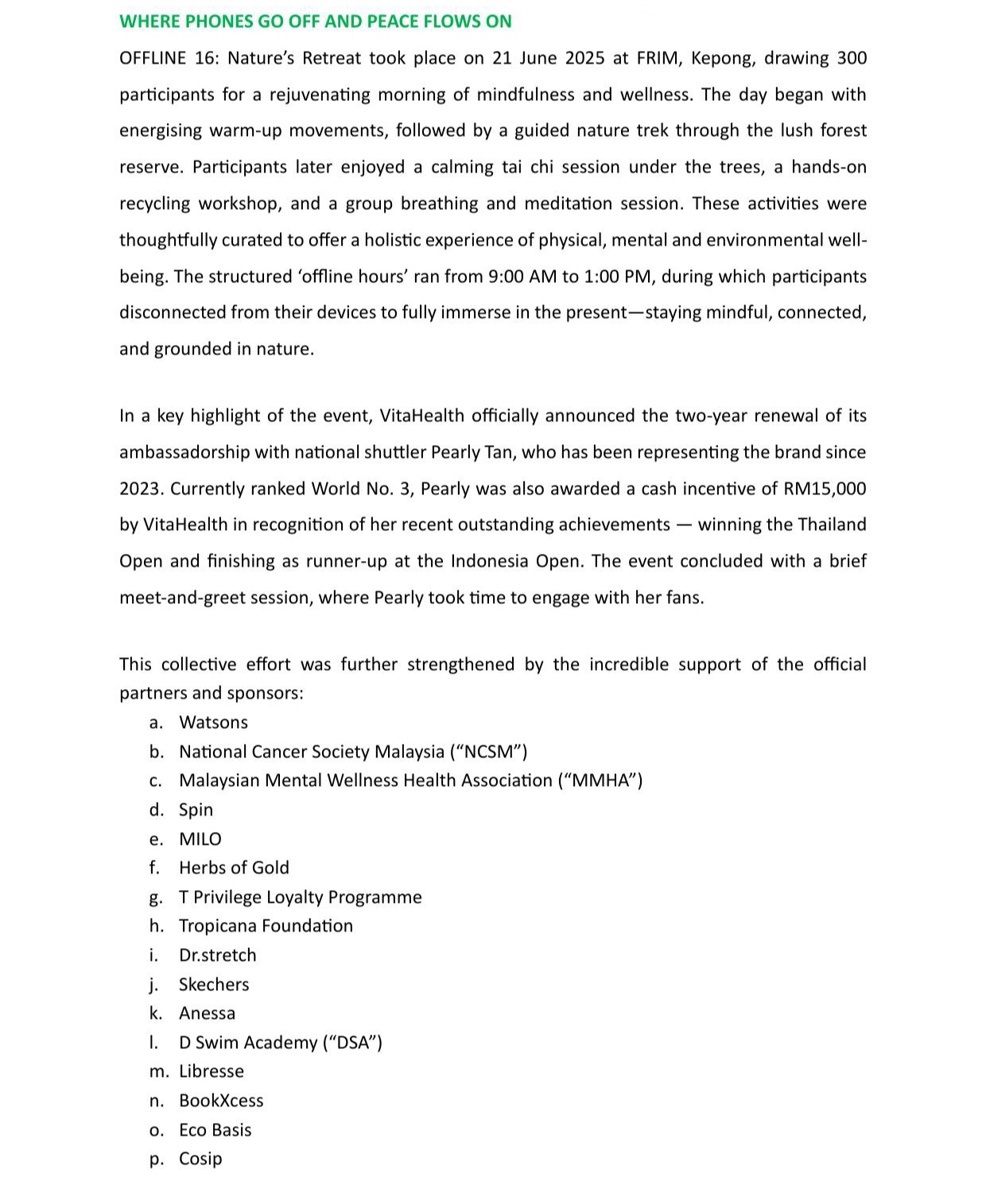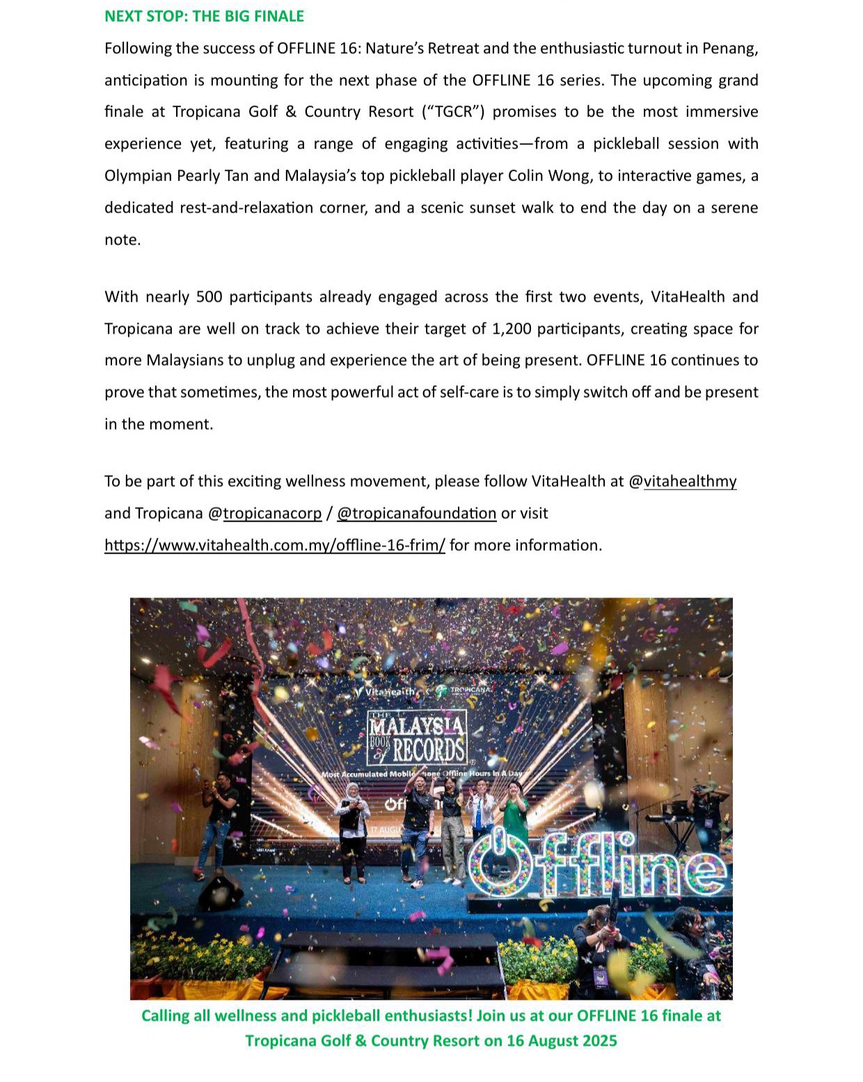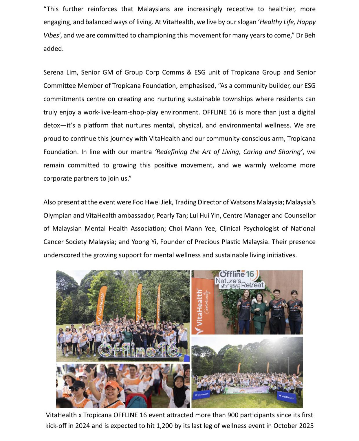 VITAHEALTH & TROPICANA CONTINUE THEIR OFFLINE 16 MOVEMENT, TO HIT 1200 PARTICIPANTS ACROSS MALAYSIA
